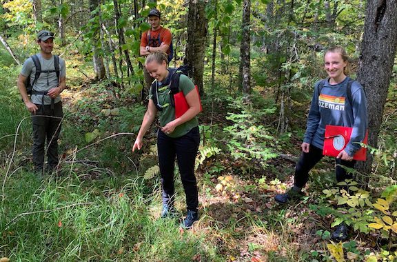 THE FALL IS AN IDEAL TIME FOR CORRIDOR MONITORING: Simon Rucker, Mike Mahony, Mary Eagan and Kayla Gagner are happy to find a boundary marker without any digging. This section of A.T. corridor is just south of Long Falls Dam road.