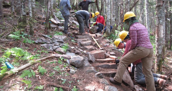 Volunteers build stone steps at Gulf Hagas using pry bars, shovels, grip hoist and pick axes.